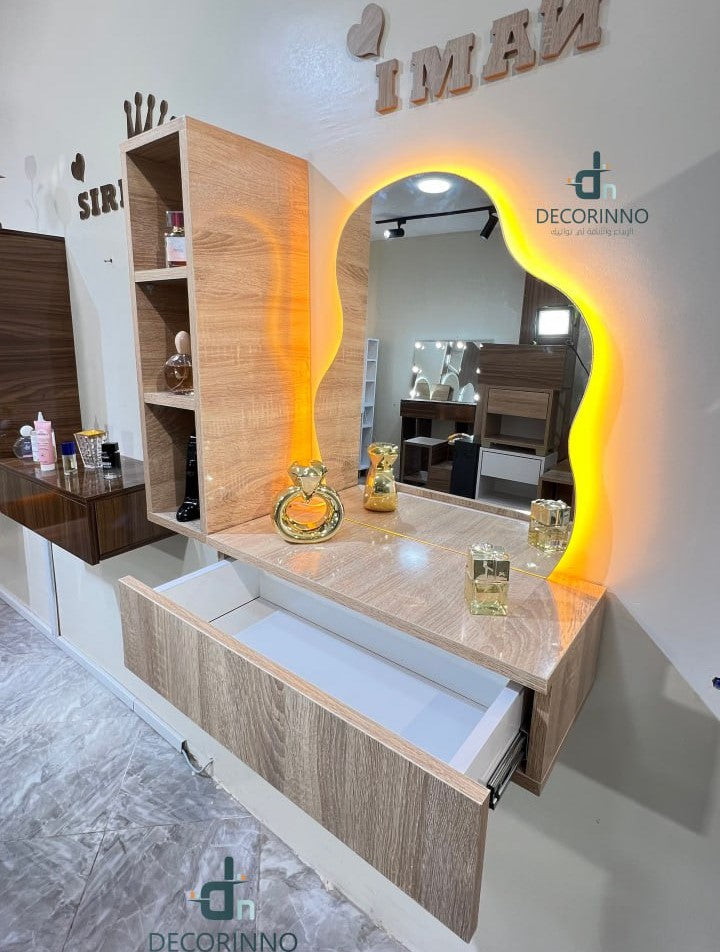 Cette coiffeuse murale au design moderne est fabriquée à la main à partir de bois MDF de qualité supérieure. Elle allie parfaitement style, praticité et fabrication artisanale marocaine, pour sublimer votre espace tout en gardant vos produits de beauté parfaitement organisés.