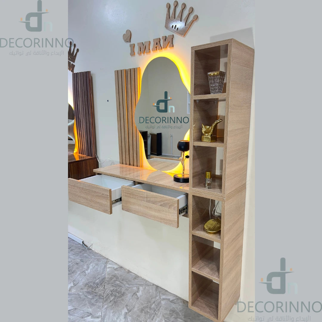 Cette coiffeuse murale au design moderne est fabriquée à la main à partir de bois MDF de qualité supérieure. Elle allie parfaitement style, praticité et fabrication artisanale marocaine, pour sublimer votre espace tout en gardant vos produits de beauté parfaitement organisés.